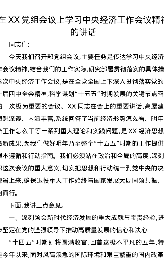 在XX党组会议上学习中央经济工作会议精神的讲话