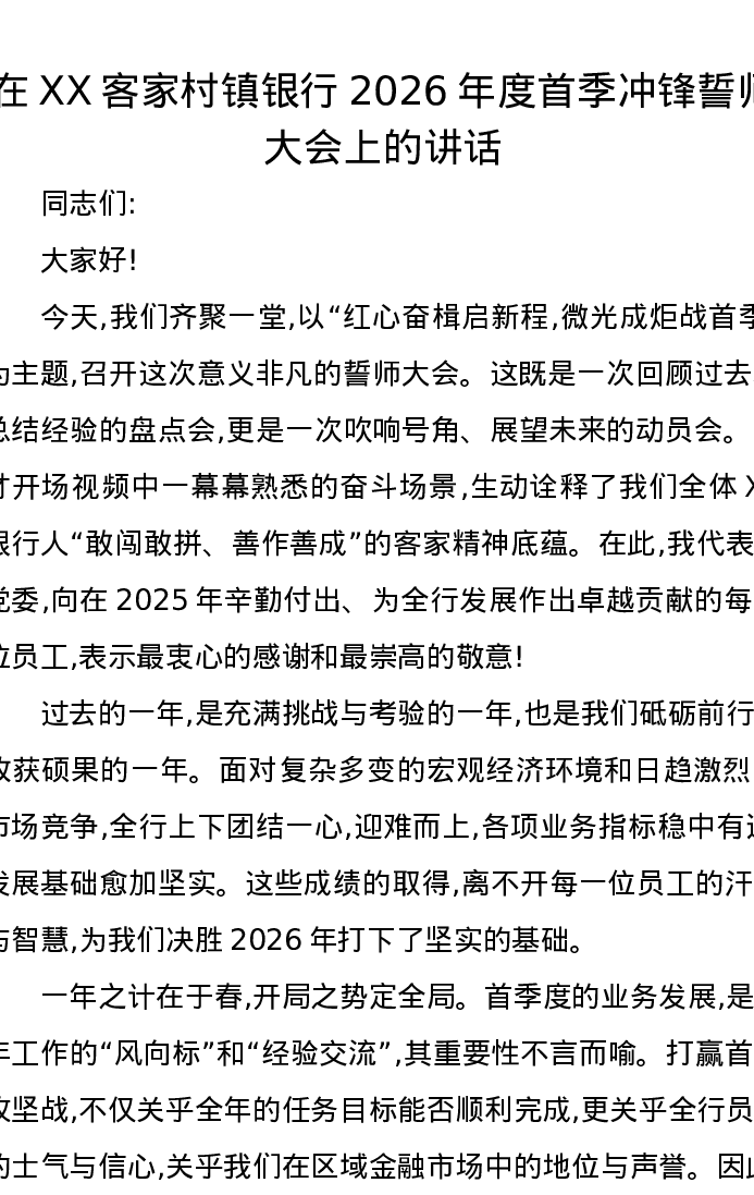 在XX客家村镇银行2026年度首季冲锋誓师大会上的讲话
