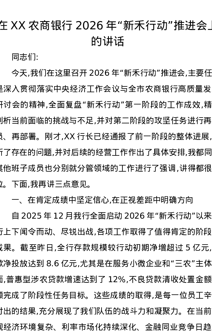 在XX农商银行2026年新禾行动推进会上的讲话