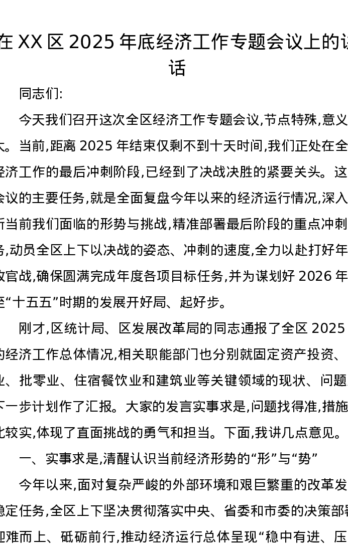 在XX区2025年底经济工作专题会议上的讲话