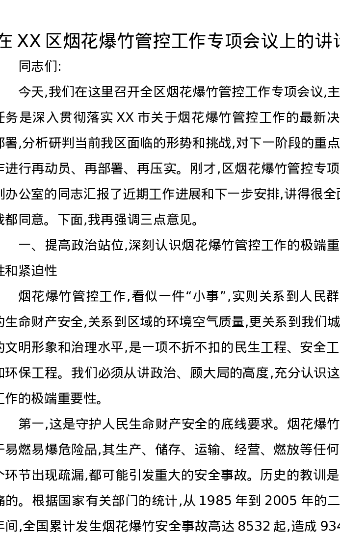 在XX区烟花爆竹管控工作专项会议上的讲话