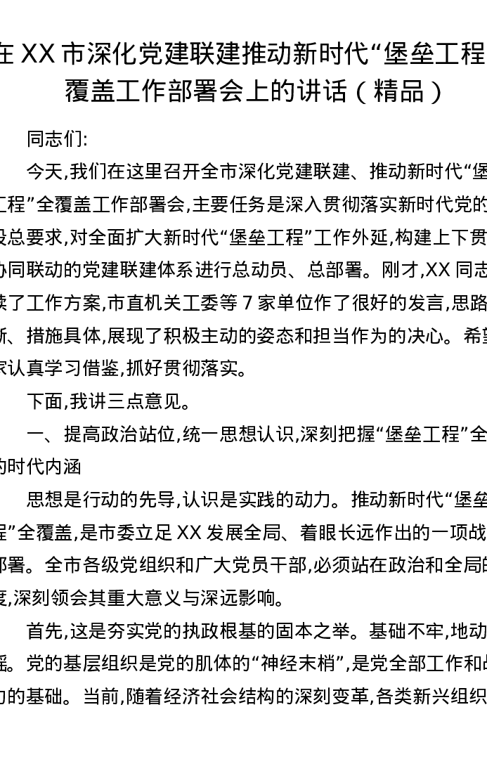 在XX市深化党建联建推动新时代堡垒工程全覆盖工作部署会上的讲话