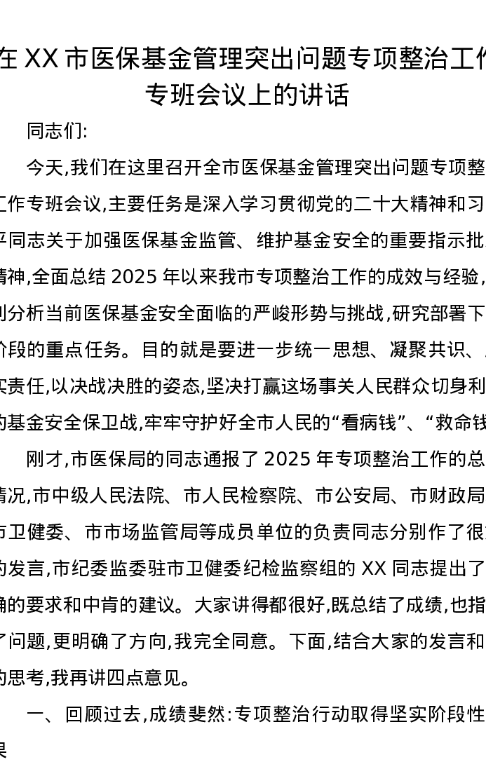 在XX市医保基金管理突出问题专项整治工作专班会议上的讲话
