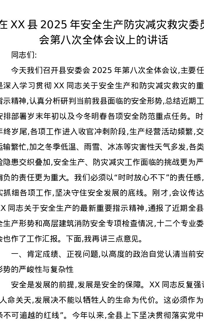 在XX县2025年安全生产防灾减灾救灾委员会第八次全体会议上的讲话