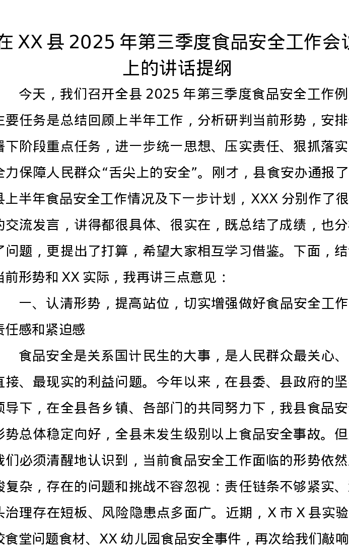 在XX县2025年第三季度食品安全工作会议上的讲话提纲