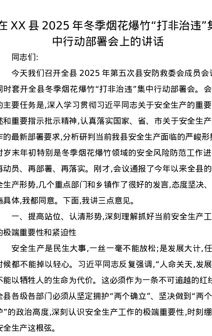 在XX县2025年冬季烟花爆竹打非治违集中行动部署会上的讲话