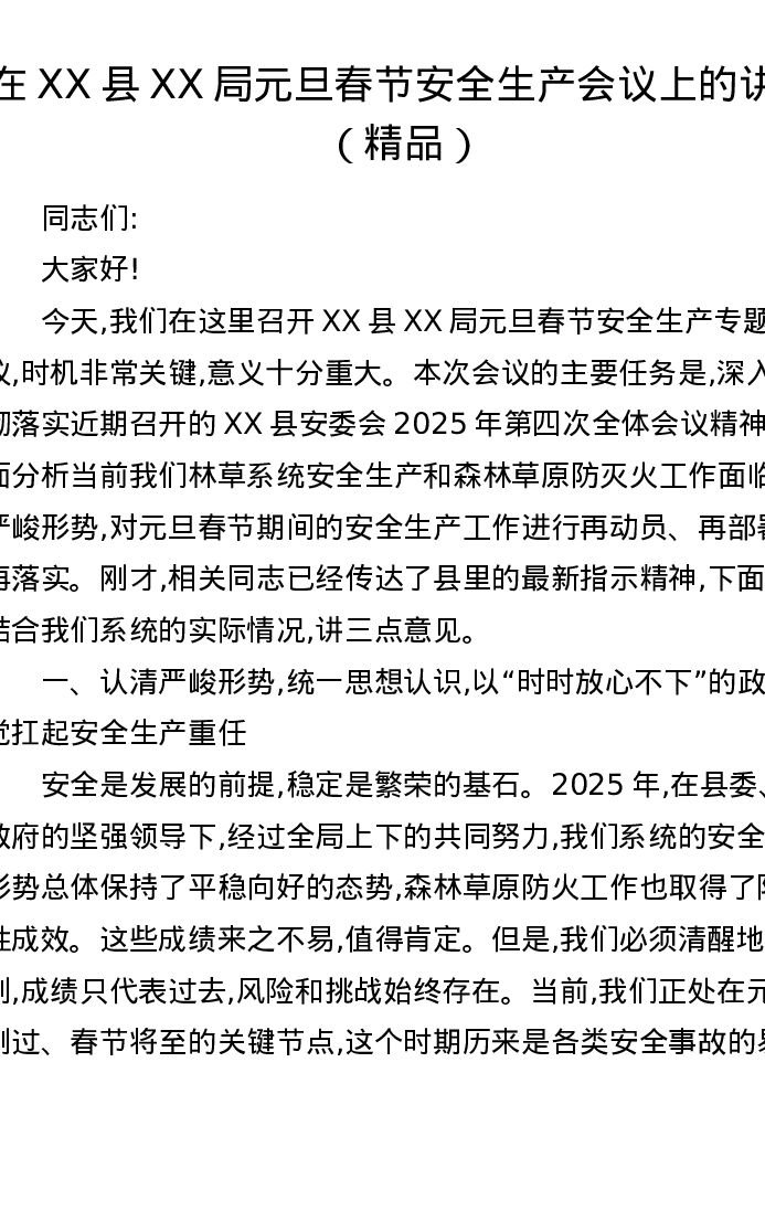 在XX县XX局元旦春节安全生产会议上的讲话