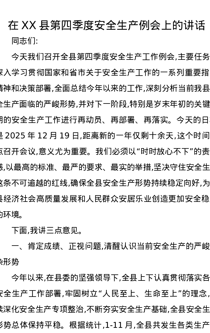 在XX县第四季度安全生产例会上的讲话