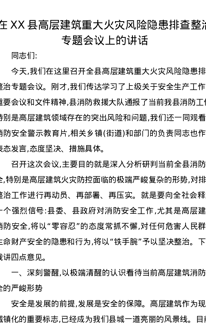 在XX县高层建筑重大火灾风险隐患排查整治专题会议上的讲话