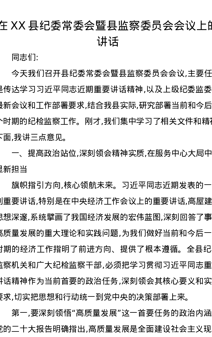 在XX县纪委常委会暨县监察委员会会议上的讲话