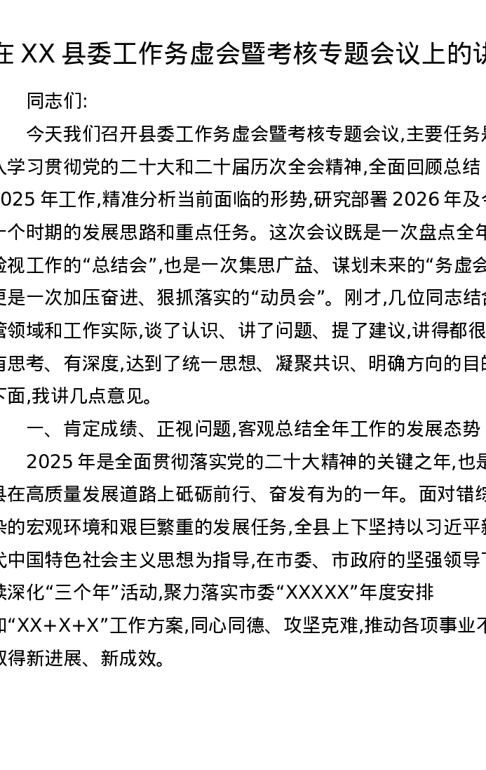 在XX县委工作务虚会暨考核专题会议上的讲话