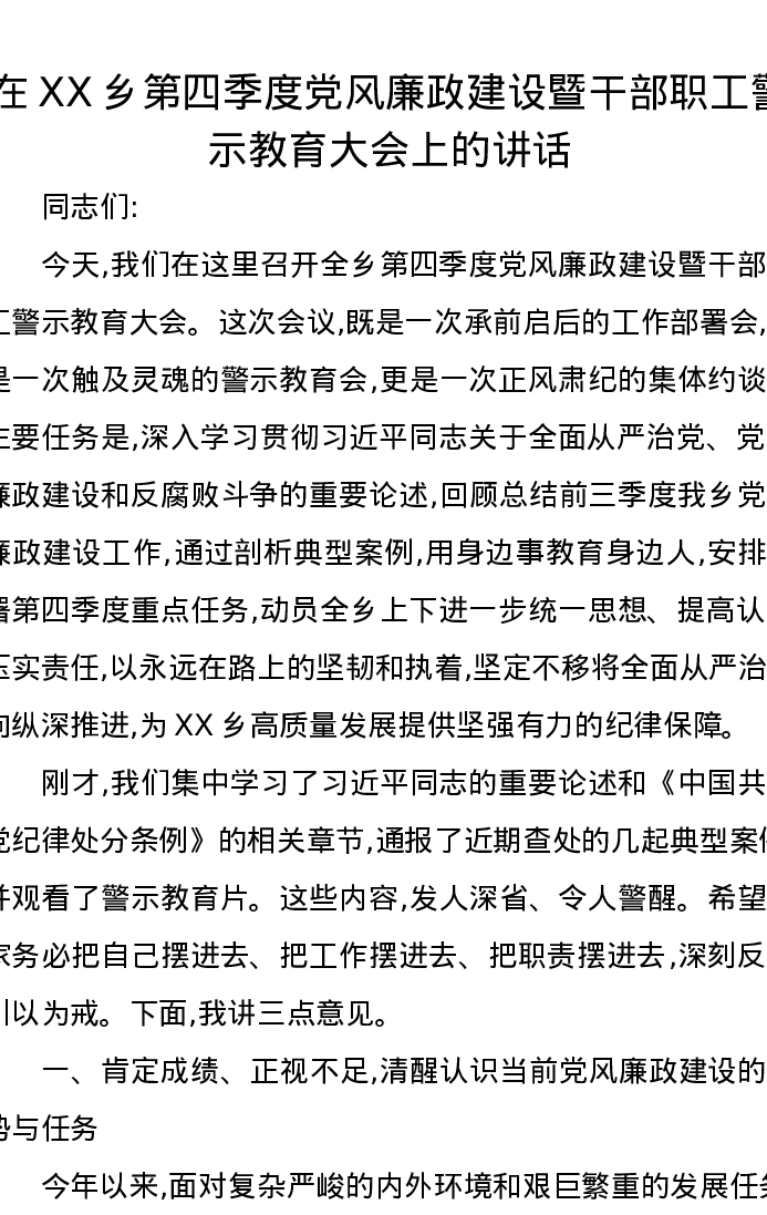 在XX乡第四季度党风廉政建设暨干部职工警示教育大会上的讲话