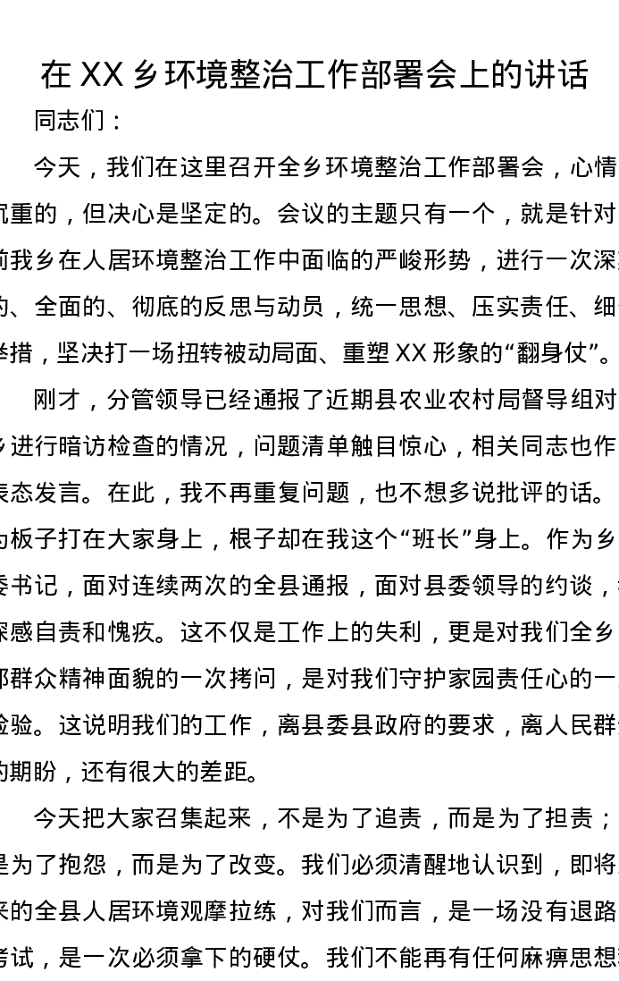 在XX乡环境整治工作部署会上的讲话
