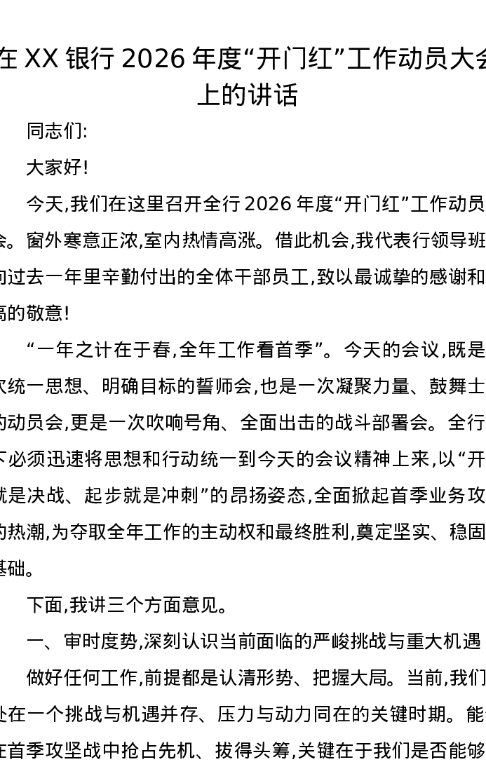 在XX银行2026年度开门红工作动员大会上的讲话
