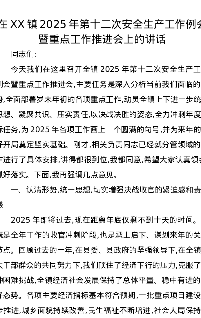 在XX镇2025年第十二次安全生产工作例会暨重点工作推进会上的讲话