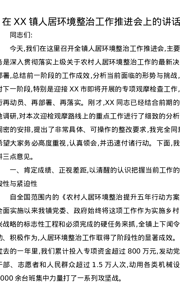 在XX镇人居环境整治工作推进会上的讲话