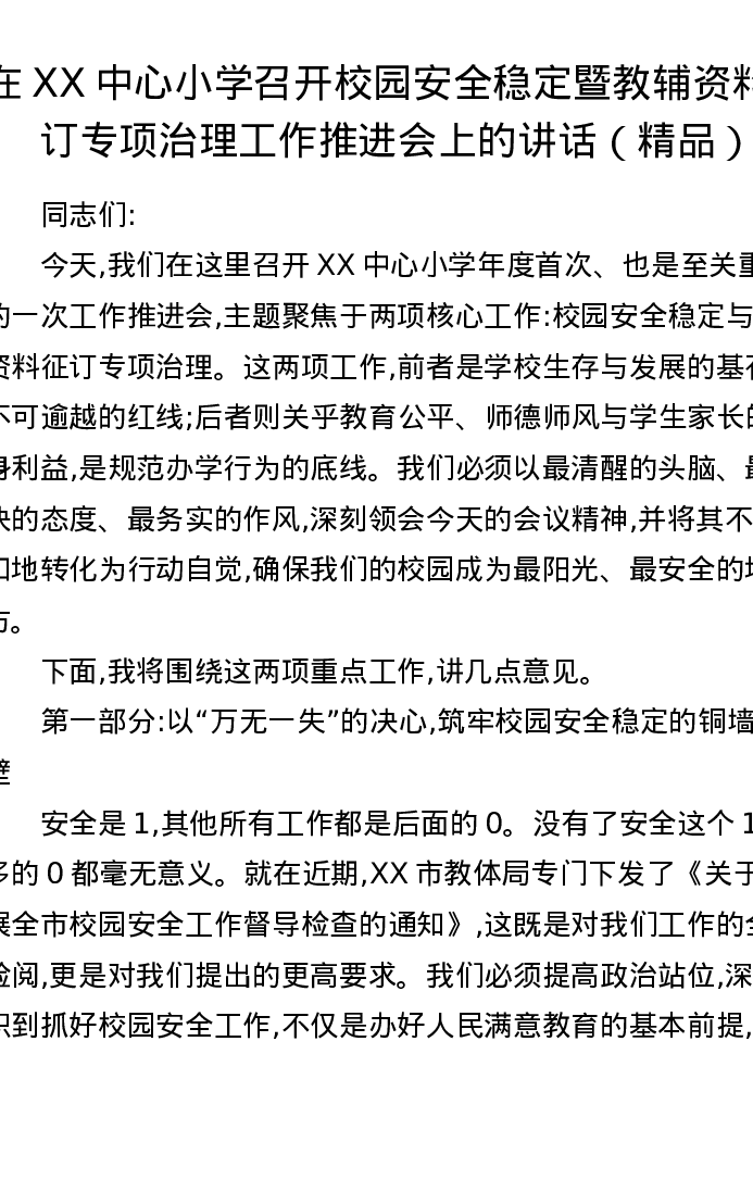 在XX中心小学召开校园安全稳定暨教辅资料征订专项治理工作推进会上的讲话