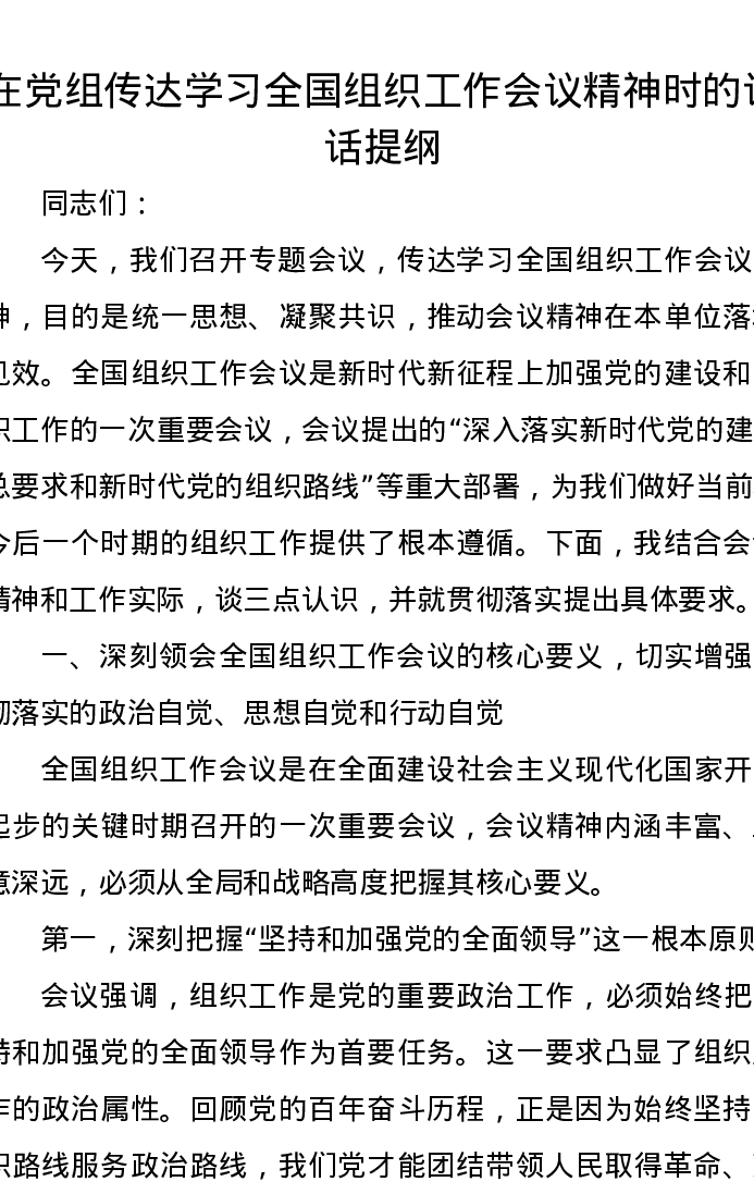 在党组传达学习全国组织工作会议精神时的讲话提纲