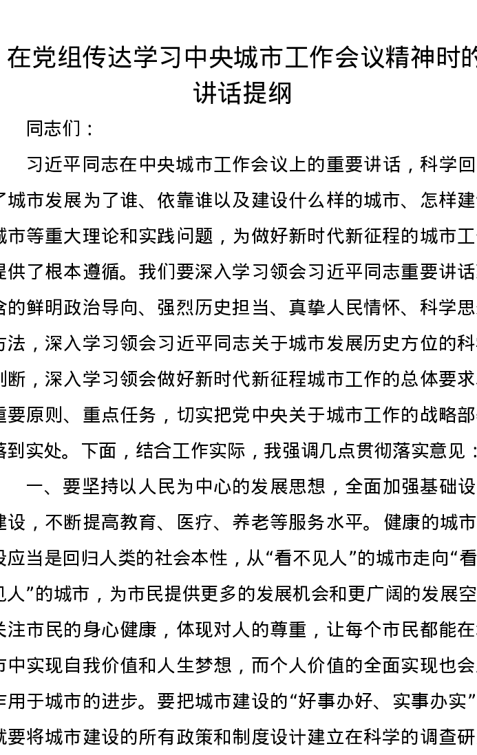 在党组传达学习中央城市工作会议精神时的讲话提纲