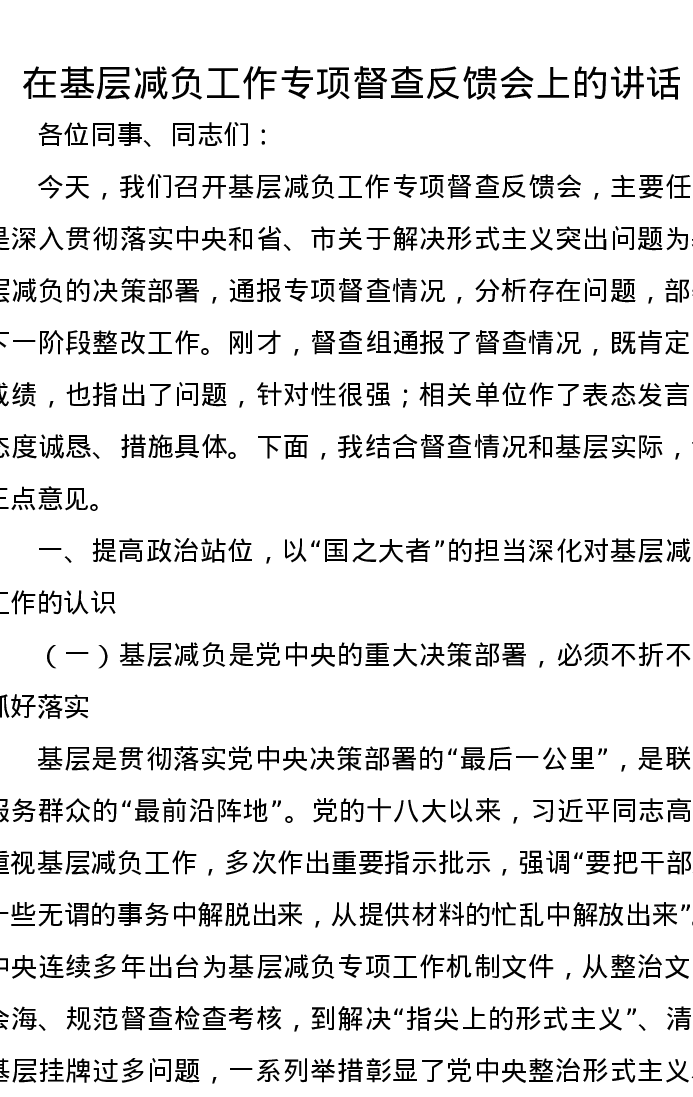 在基层减负工作专项督查反馈会上的讲话