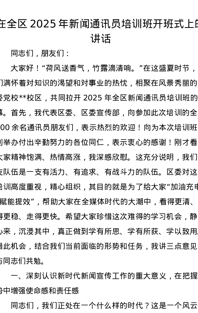 在全区2025年新闻通讯员培训班开班式上的讲话
