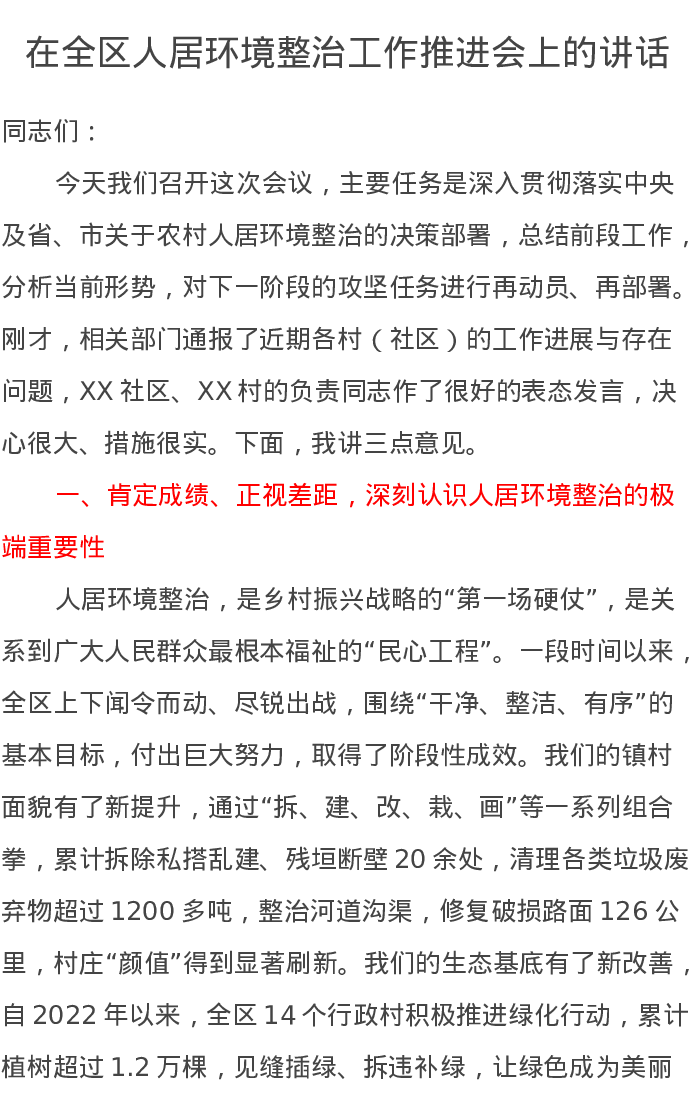 在全区人居环境整治工作推进会上的讲话