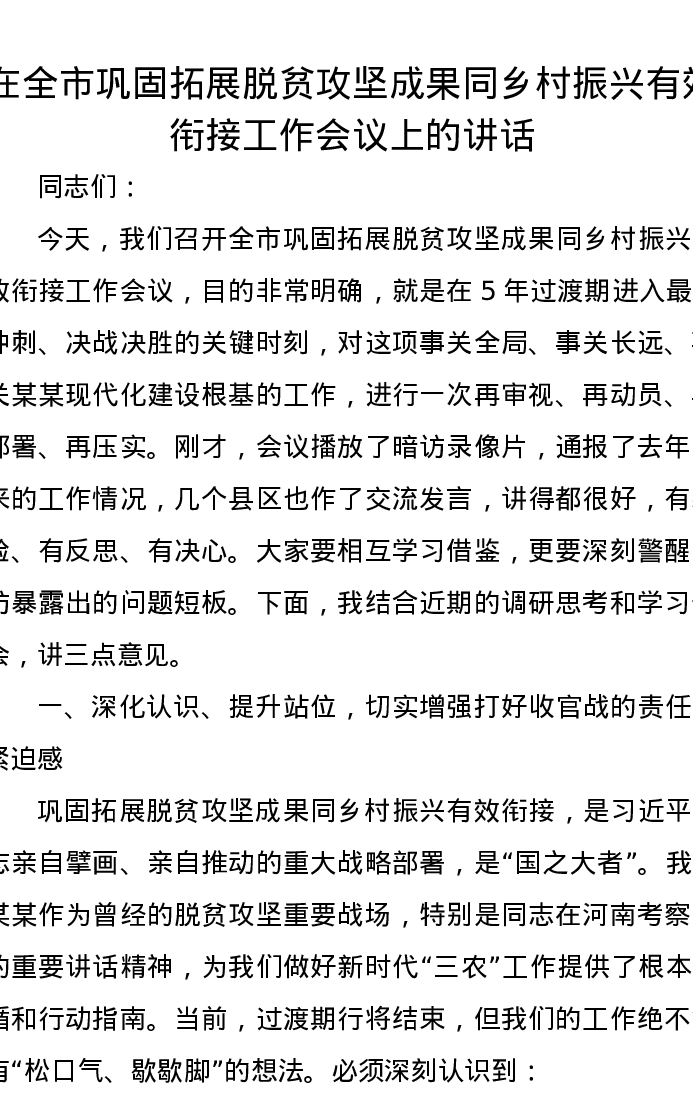 在全市巩固拓展脱贫攻坚成果同乡村振兴有效衔接工作会议上的讲话
