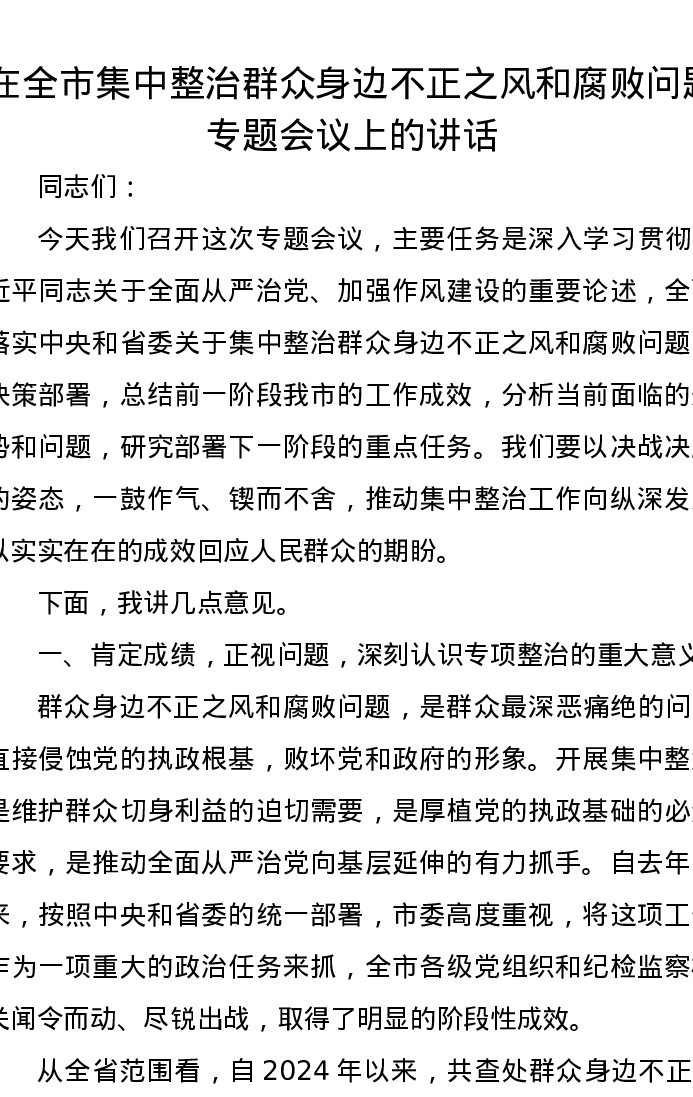 在全市集中整治群众身边不正之风和腐败问题专题会议上的讲话