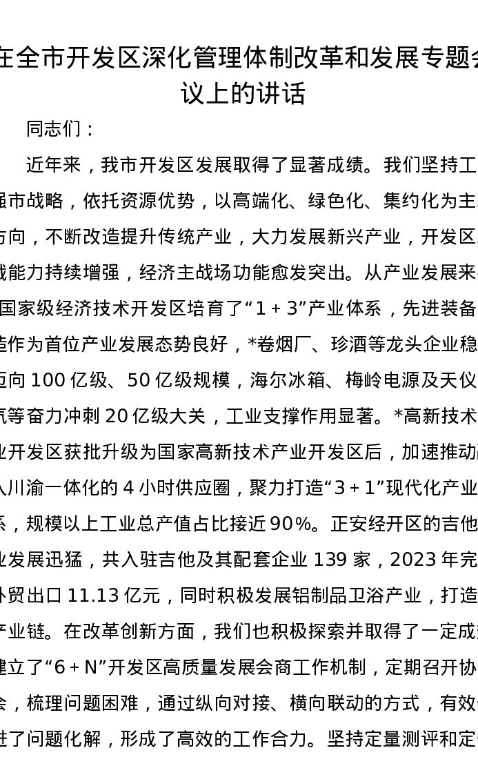 在全市开发区深化管理体制改革和发展专题会议上的讲话