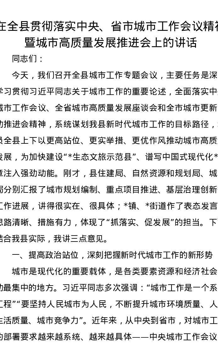 在全县贯彻落实中央、省市城市工作会议精神暨城市高质量发展推进会上的讲话