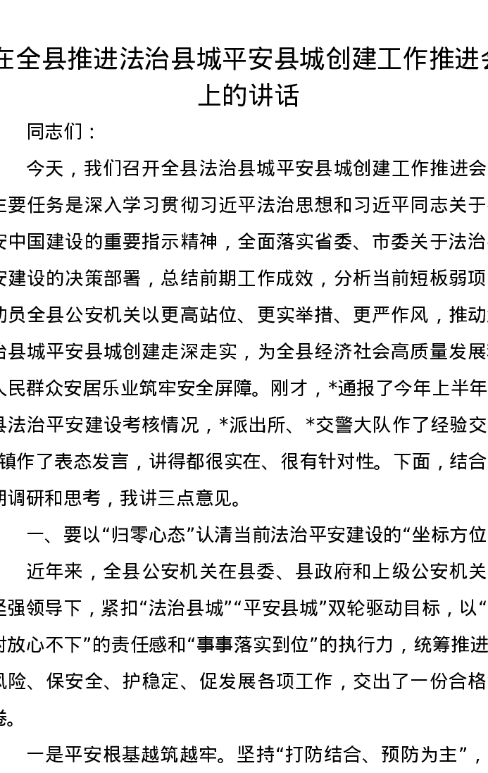在全县推进法治县城平安县城创建工作推进会上的讲话