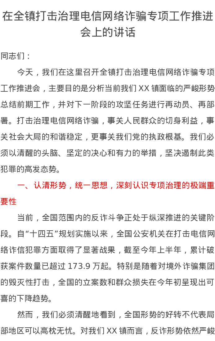 在全镇打击治理电信网络诈骗专项工作推进会上的讲话