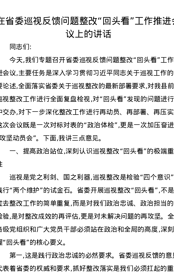 在省委巡视反馈问题整改回头看工作推进会议上的讲话