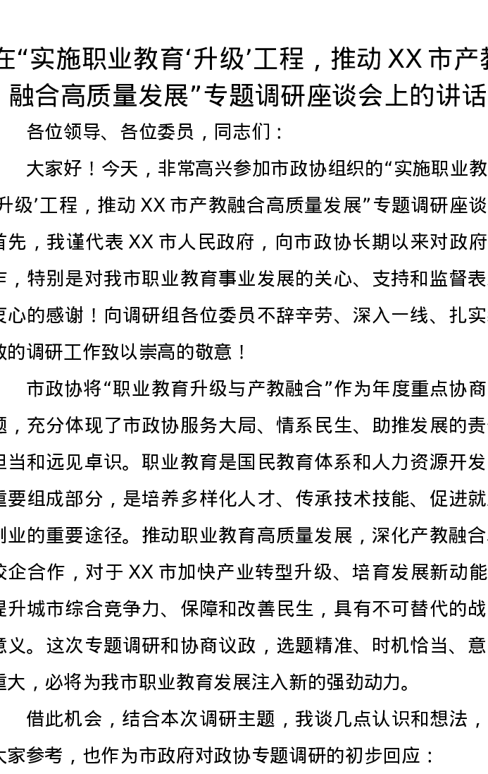 在实施职业教育‘升级’工程,推动XX市产教融合高质量发展专题调研座谈会上的讲话