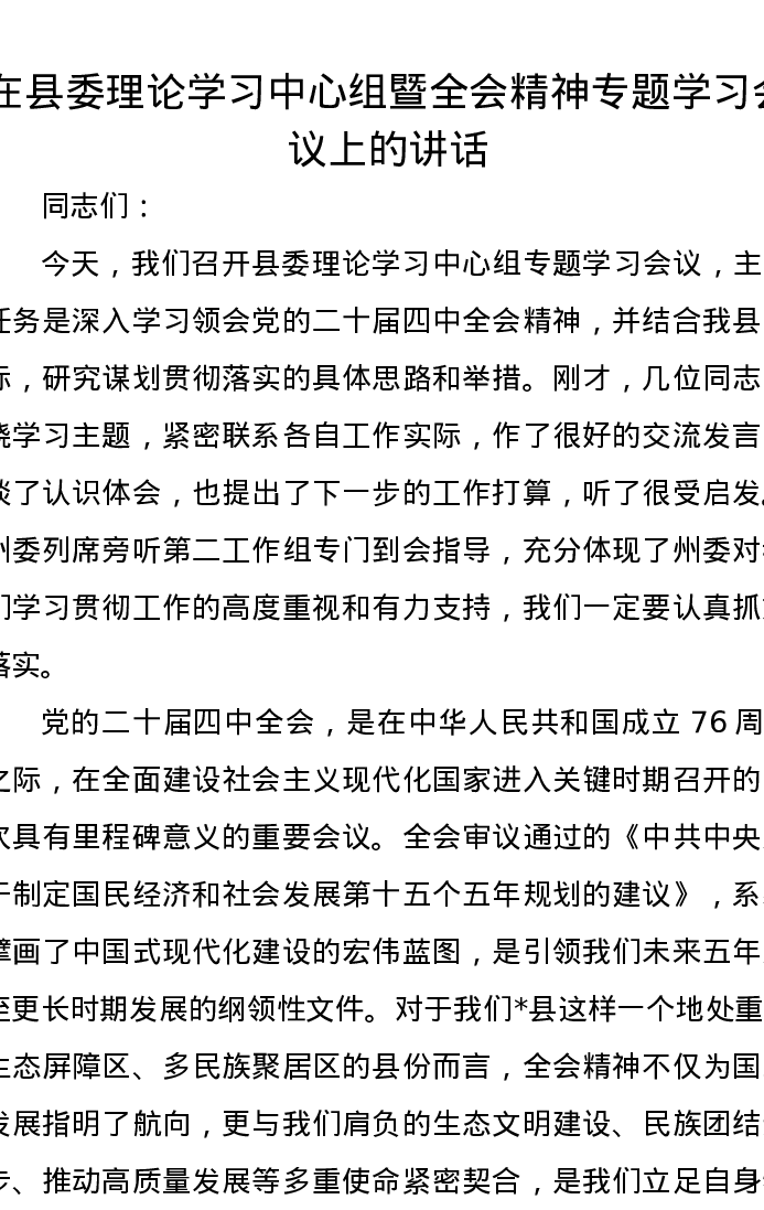 在县委理论学习中心组暨全会精神专题学习会议上的讲话