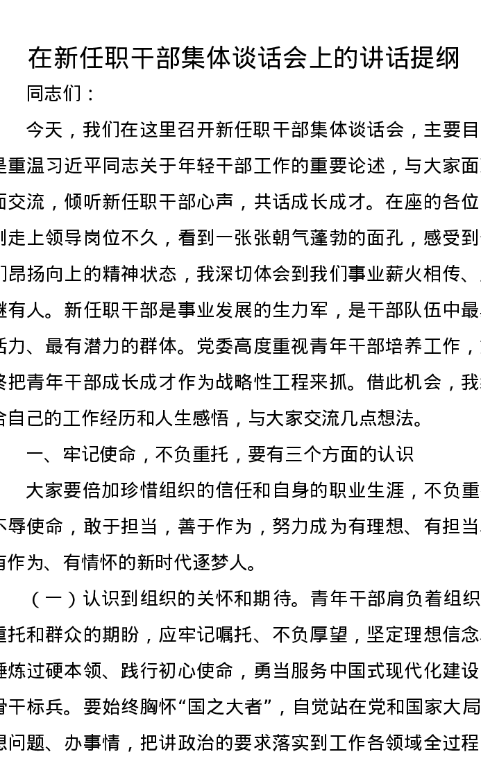 在新任职干部集体谈话会上的讲话提纲