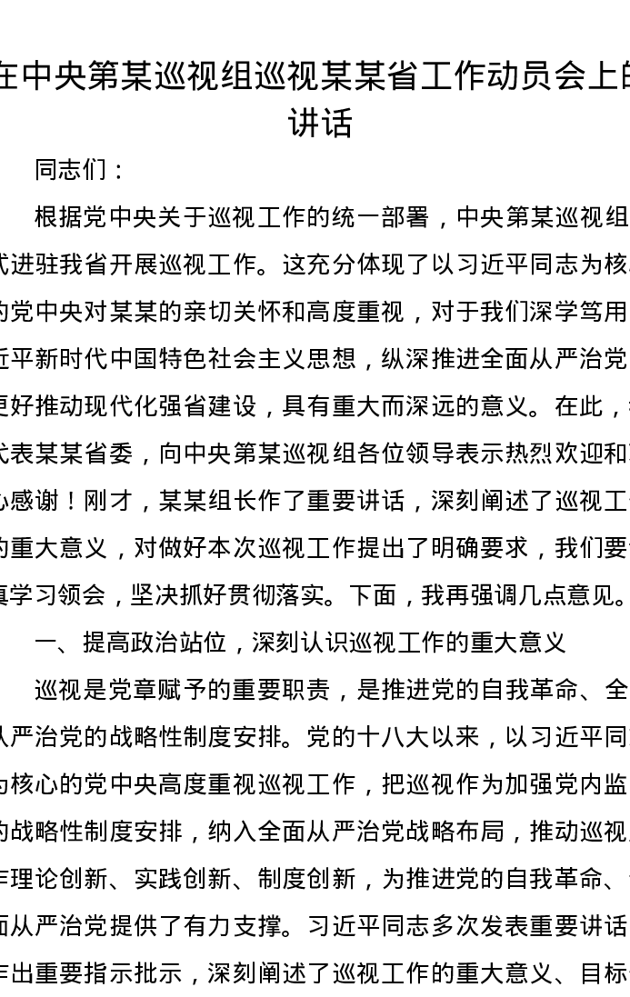 在中央第某巡视组巡视某某省工作动员会上的讲话