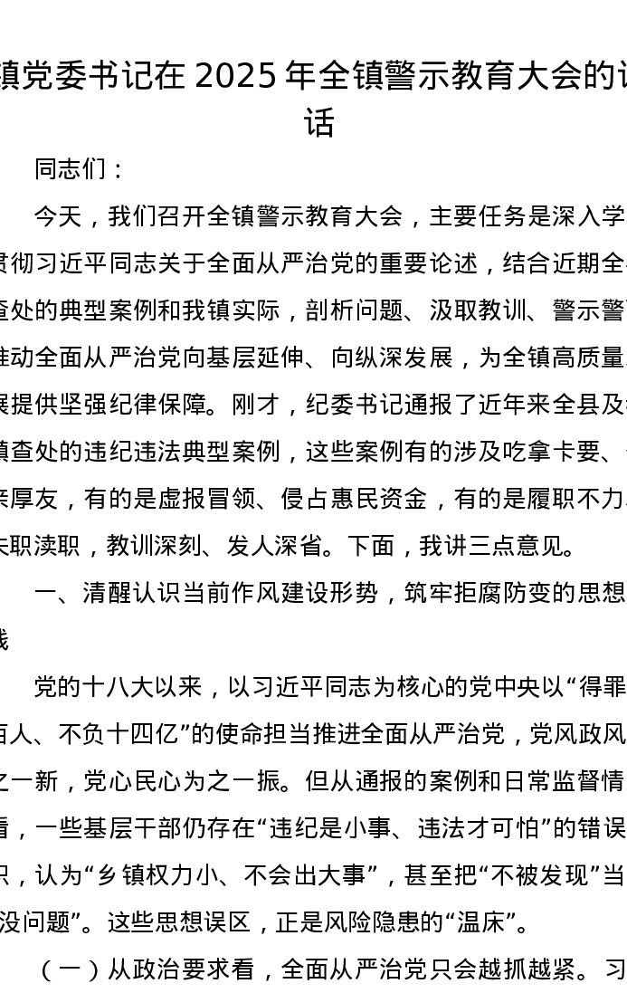 镇党委书记在2025年全镇警示教育大会的讲话