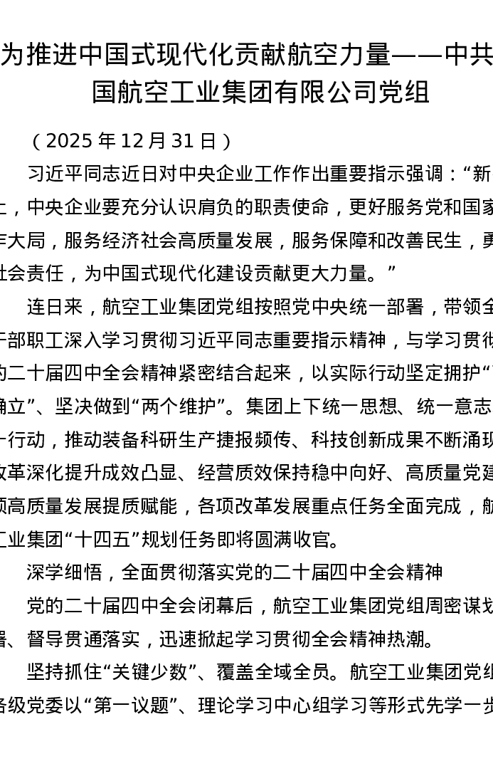 为推进中国式现代化贡献航空力量——中共中国航空工业集团有限公司党组