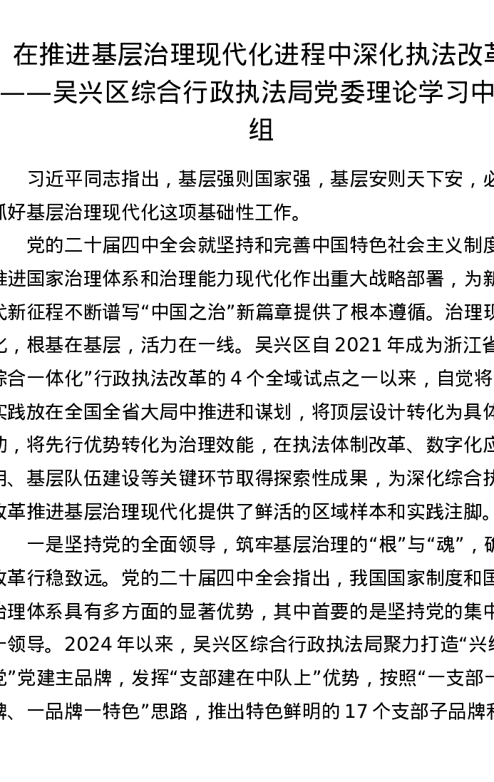 在推进基层治理现代化进程中深化执法改革——吴兴区综合行政执法局党委理论学习中心组