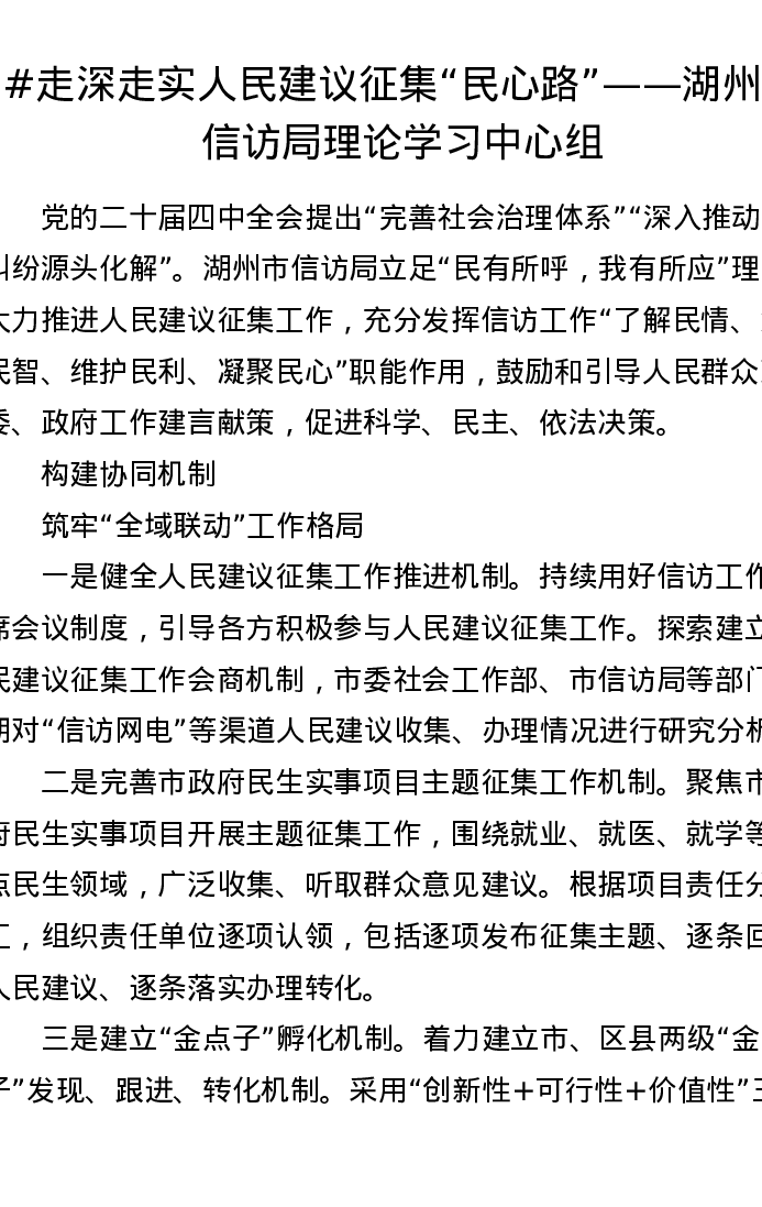 走深走实人民建议征集民心路——湖州市信访局理论学习中心组