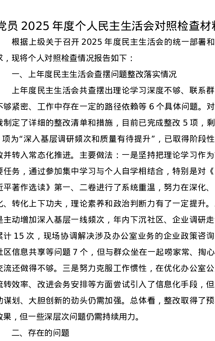 党员2025年度个人xxxxx对照检查材料(五个带头)