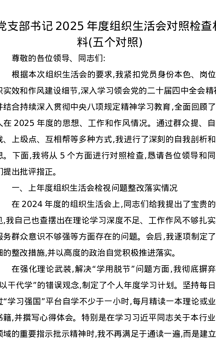 党支部书记2025年度组织xxx对照检查材料(五个对照)