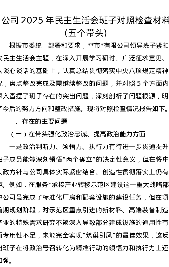 公司2025年xxxxx班子对照检查材料(五个带头)