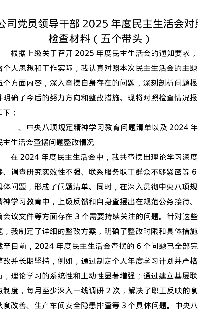 公司党员领导干部2025年度xxxxx对照检查材料(五个带头)