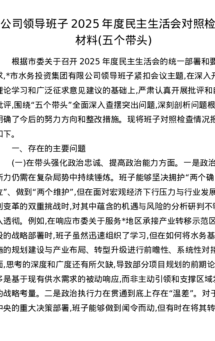 公司领导班子2025年度xxxxx对照检查材料(五个带头)【水务投资集团】