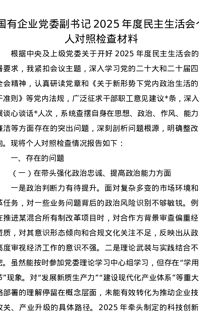 国有企业党委副书记2025年度xxxxx个人对照检查材料(五个带头)