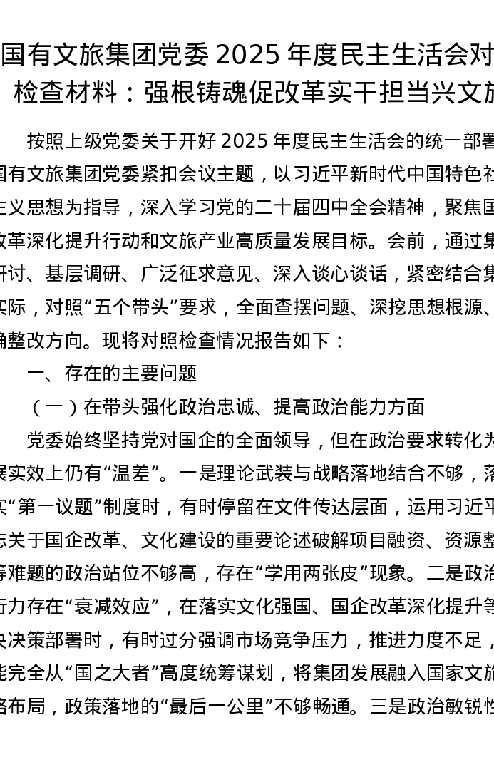 国有文旅集团党委2025年度xxxxx对照检查材料:强根铸魂促改革 实干担当兴文旅(五个带头)