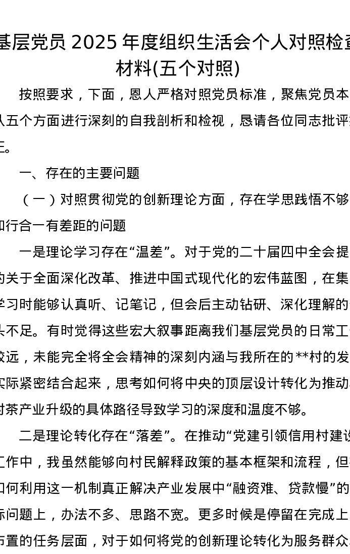 基层党员2025年度组织xxx个人对照检查材料(五个对照)