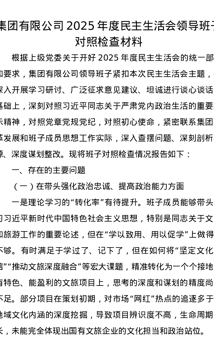 集团有限公司2025年度xxxxx领导班子对照检查材料